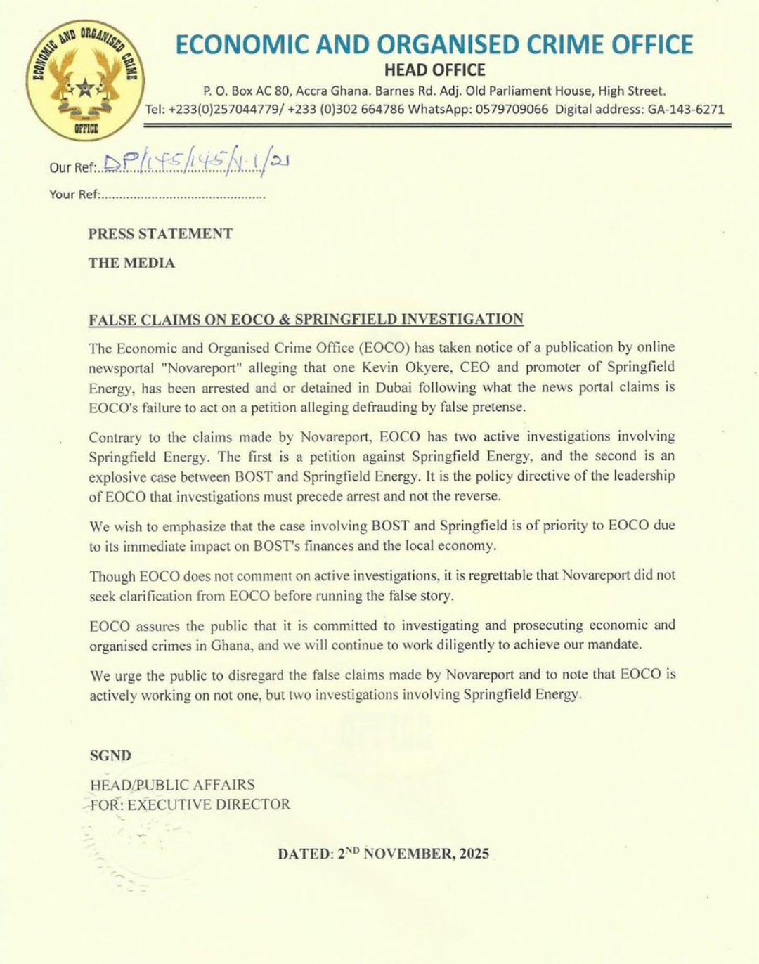 The Economic and Organised Crime Office (EOCO) has firmly refuted a recent online report alleging the arrest of Springfield Energy’s CEO, Kevin Okyere, in Dubai.