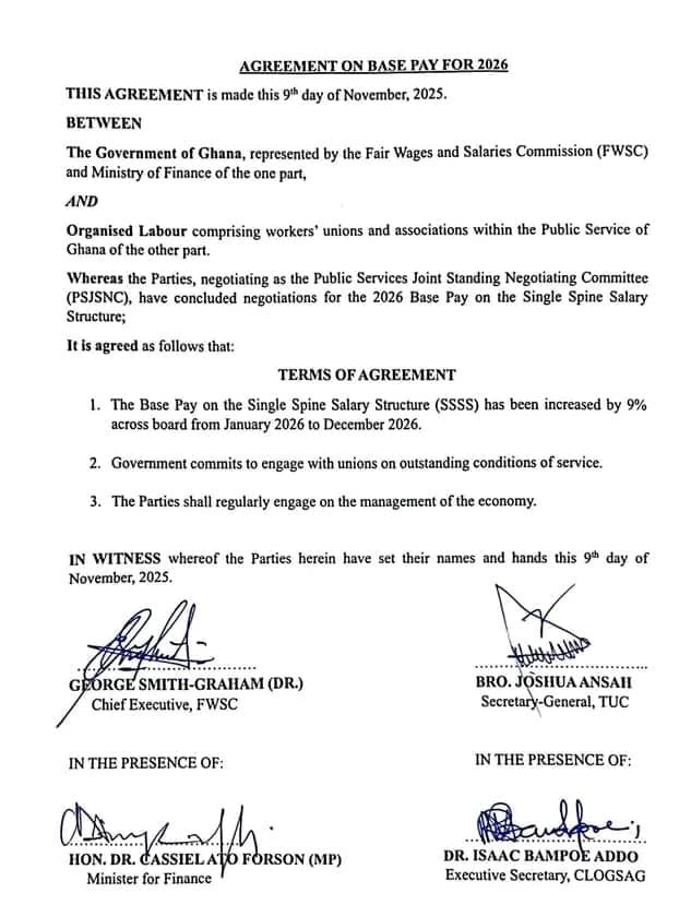 The Government of Ghana and Organised Labour have successfully concluded negotiations, finalizing a 9% increase in the Base Pay on the Single Spine Salary Structure (SSSS) for the 2026 financial year.