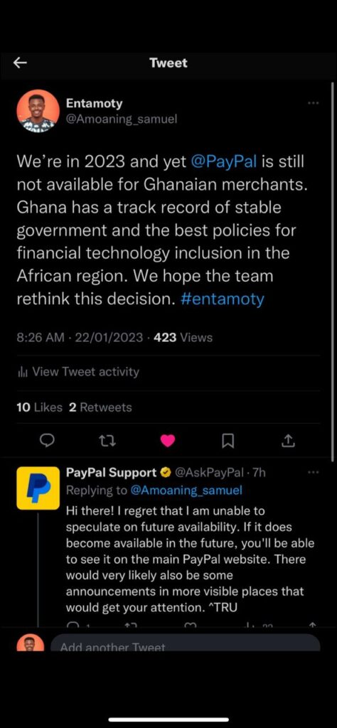 There may be other economic, political, and security reasons for which the App is not present in Ghana. That notwithstanding, If one has partners overseas who want to use the App for transactions and notice the country is not on the app, the country may seem unattractive. Though there are other online platforms for such transactions, to the average European or American, PayPal is the most trusted and secure online transaction platform.