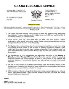The Ghana Education Service (GES) has announced that the government has fully settled all outstanding arrears of the Capitation Grant for basic schools, covering the period from 2023 to date.