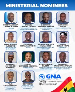 The other named ministries numbering fourteen are also on the list. These are: Ministry of Defence, Ministry of Communication, Digital Technology and Innovations, Ministry of Lands and Natural Resources, Ministry of Sports and Recreation, Ministry of Labour, Jobs and Employment, Ministry of Health, Ministry of Environment, Science and Technology, Ministry of Transport, Ministry of Interior, Ministry of Foreign Affairs, Ministry of Works, Housing and Water Resources, Minister of State in Charge of Special Initiates, Minister of State, Government Communication, Minister of State, Climate Change and Sustainability.