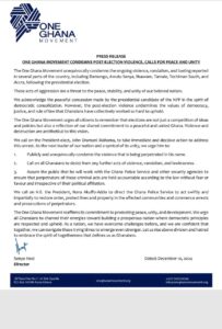 One Ghana Movement Condemns Post-election violence – press release POLITICS By Enoch Afful On Dec 10, 2024 0 Spread the loveThe One Ghana Movement condemns the ongoing violence in several parts of the country. After several observance and monitoring of post December 7th general elections, the group has come out with a firm statement in condemnation of the violence Spread the love