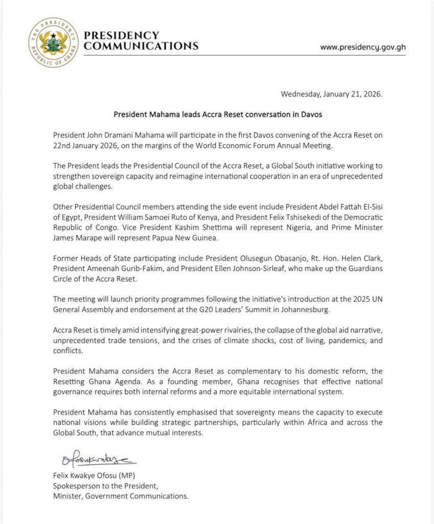 President John Dramani Mahama is set to spearhead a pivotal global dialogue. Indeed, he will lead the first Davos convening of the Accra Reset on January 22, 2026, strategically scheduled on the sidelines of the World Economic Forum Annual Meeting.
