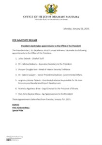 President elect John Dramani Mahama has made appointments which will take effect tomorrow Tuesday 7th January 2025.