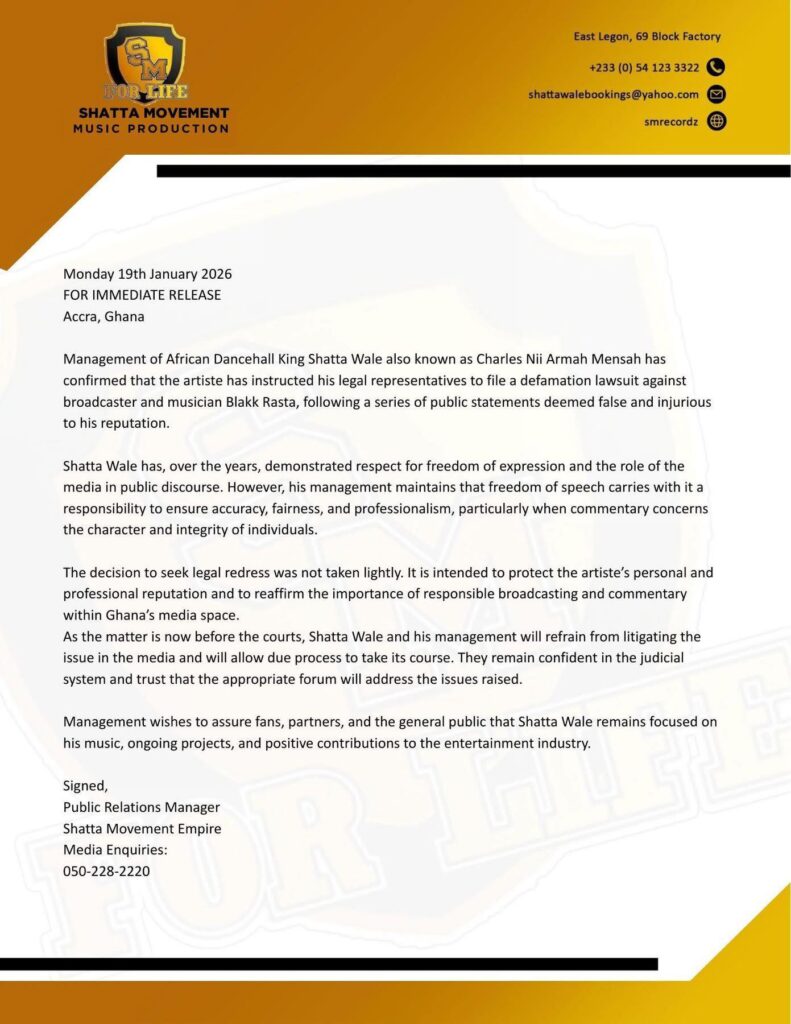 This decision comes directly in response to a series of public statements made by Blakk Rasta, which Shatta Wale’s team describes as false and severely damaging to the artist’s reputation.