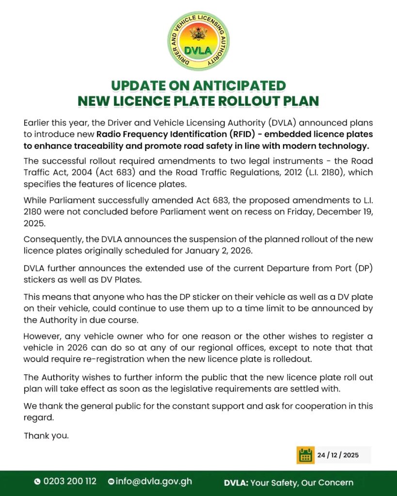 This decision follows a delay in the necessary parliamentary approvals. Specifically, while updates to the Road Traffic Act were completed, the required amendments to the supporting Road Traffic Regulations (L.I. 2180) could not be finalized before Parliament’s recent recess.