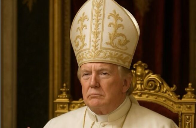 On May 3, 2025, Trump shared an AI-generated image on his Truth Social platform and the official White House X account, showing himself dressed in papal regalia (white cassock, mitre, and crucifix) with a solemn expression and raised finger