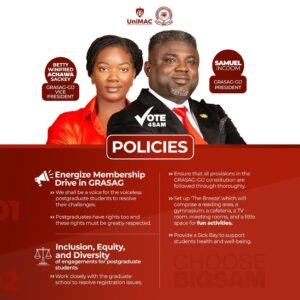 His fierce rival, Mr A. Samuel Inkoom, who is a graduate student, MA PR with Marketing was the first runner-up. Samuel A. Inkoom, cool, calm but succinct in his speech with his vice Gayobi Achawa, ravishing, exuberant and eloquent young woman still advance plans for UNIMAC-GIJ graduate school despite not winning the grand prize of presidency.