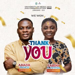 Prince Abada, a young, passionate but unassuming MA Development communication student emerged as the winner of the election along with his vice president Sabina A. Tetteh.